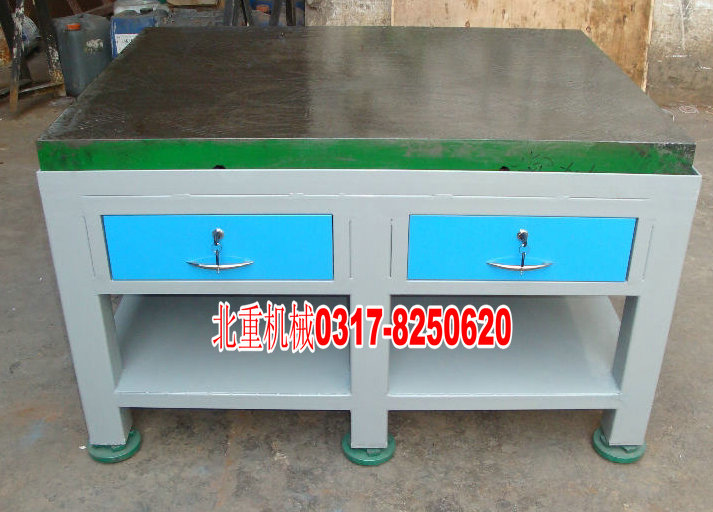 鑄鐵模具平臺(tái)結(jié)構(gòu):制成筋板式和箱體式,工作面有長方形、正方形或圓形,鑄鐵模具平臺(tái)工作面采用刮削工藝,工作面上可加工V形、T形、U形槽和圓孔、長孔等。鑄鐵模具平臺(tái)一般人認(rèn)為只要有一定的厚度,那么就不會(huì)發(fā)生形變,其實(shí)實(shí)際上并不是這個(gè)樣子的,鑄鐵模具平臺(tái)的結(jié)構(gòu)工藝也是尤為的重要。鑄鐵模具平臺(tái)結(jié)構(gòu)穩(wěn)定取決于平板的高度,板面的厚度,周邊圍子的厚度,拉筋的厚度及高度。而并不只是在于厚度。鉗工臺(tái)實(shí)心面板厚度為20mm,凈重約1.1T,材質(zhì)為HT200,硬度HB170-240,支架80*80方管,高度為550mm,加支架高度為800mm。